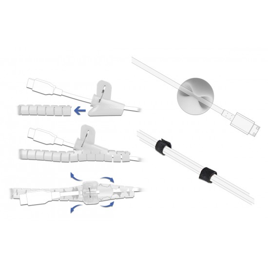 Το σετ αποτελείται από 3x οργανωτές καλωδίων σιλικόνης, 1x δεματικό καλωδίων πλαστικό και 1x ταινία τύπου velcro.