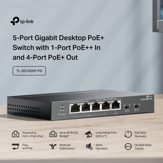 TP-LINK desktop switch TL-SG1005P-PD, 5x Gigabit θύρες, PoE+, UN/1.0