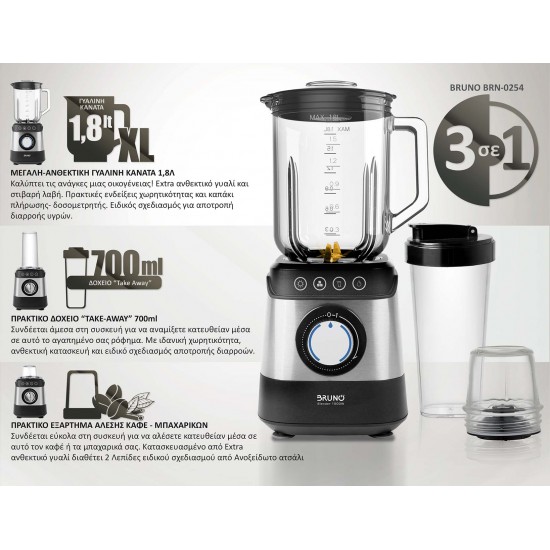 BRUNO μπλέντερ 3 σε 1 προηγμένων λειτουργιών BRN-0254, 1500W, 1.8L γυάλινη κανάτα, 6 λεπίδες, inox-μαύρο