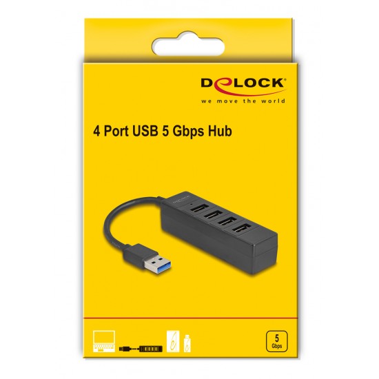 DELOCK USB hub 64350, 4x θυρών, USB 3.0, 5Gbps, USB σύνδεση, μαύρος