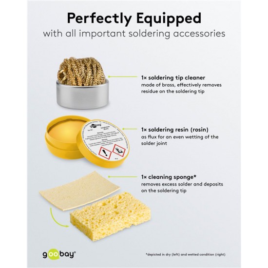 Επιπλέον, διαθέτει θέση για κολλητήρι ενώ στη συσκευασία συμπεριλαμβάνονται σφουγγάρι, συρμάτινο σφουγγάρι και πάστα συγκόλλησης.