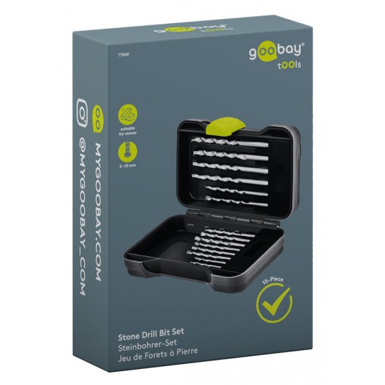 Σετ τρυπάνια της Goobay που αποτελείται από 15 τρυπάνια σε διαφορετικά μεγέθη, κατάλληλα για χρήση σε τοίχους και μπετόν.