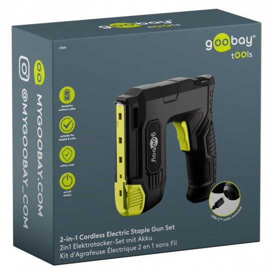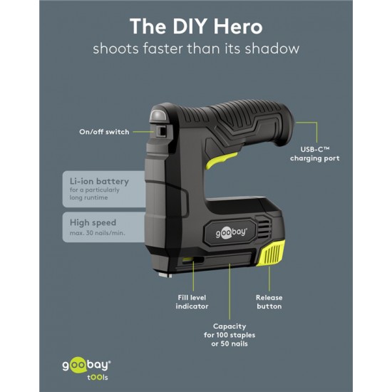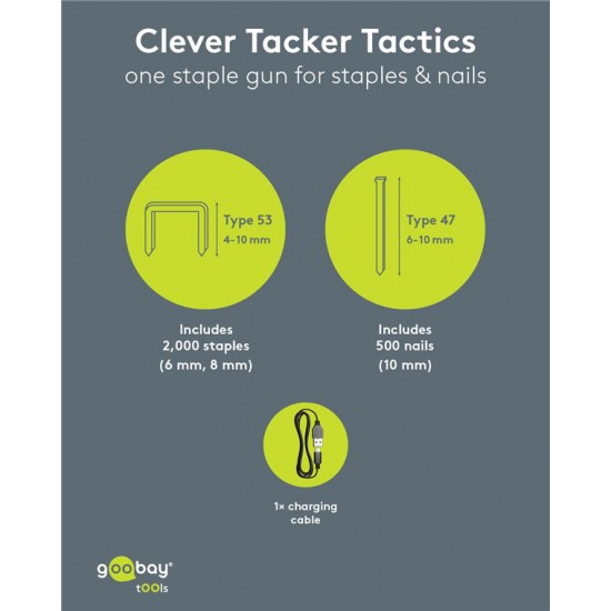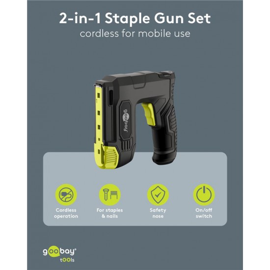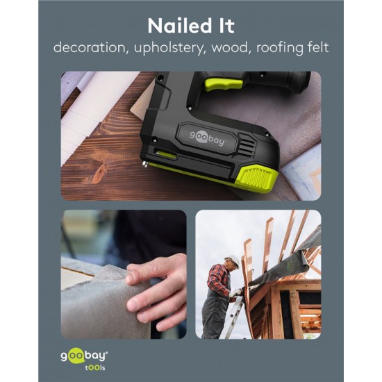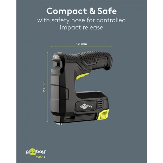Πρακτικό και ισχυρό, ασύρματο καρφωτικό μπαταρίας της Goobay, ιδανικό για επισκευές/συναρμολογήσεις επίπλων, εργασίες ταπετσαρίας, στερέωση μονωτικών υλικών ή σοβατεπιών και DIY εφαρμογές.