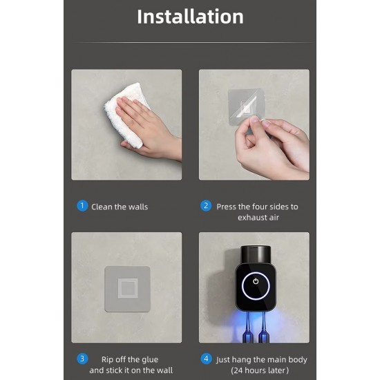 Τοποθετείται στον τοίχο, με ισχυρή αυτοκόλλητη βάση, με κρεμαστράκι πάνω στο οποίο μπορείτε να τοποθετείτε και να αφαιρείτε τον αποστειρωτή πολύ εύκολα.