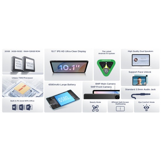 Με 4GB (+16GB virtual) RAM και 128GB ROM για να αποθηκεύετε τα αγαπημένα σας αρχεία, φωτογραφίες και βίντεο. Επιπλέον, προσφέρει την δυνατότητα να επεκτείνετε τον χώρο αποθήκευσης του tablet με κάρτα micro SD έως 2TB.
