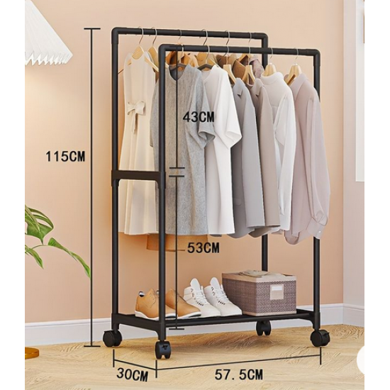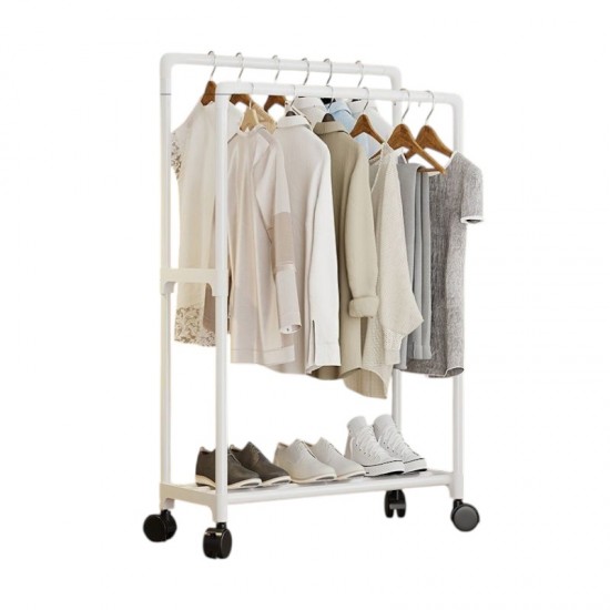 Τροχήλατη κρεμάστρα δαπέδου διπλή με ράφι παπουτσιών, ιδανική ως έπιπλο εισόδου ή για την οργάνωση των ρούχων στο δωμάτιό σας . Διαστάσεις: 115 x 57.5 x 30 cm.