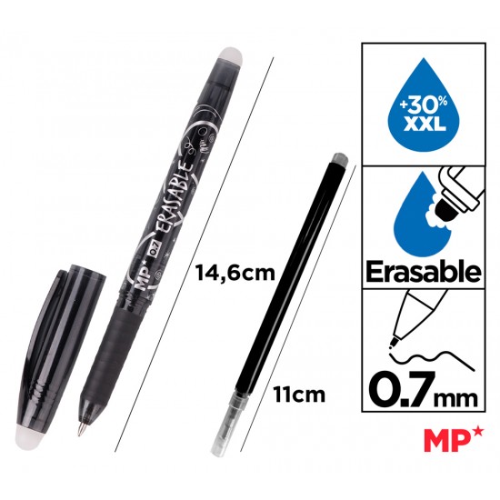 Στυλό διαρκείας της MP με μελάνι που σβήνει μέσω της ειδικής γόμας που διαθέτει. Διαθέτει καπάκι με κλιπ για να ασφαλίζει στις τσέπες των ρούχων και στα τετράδια.