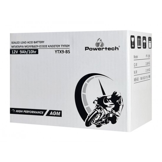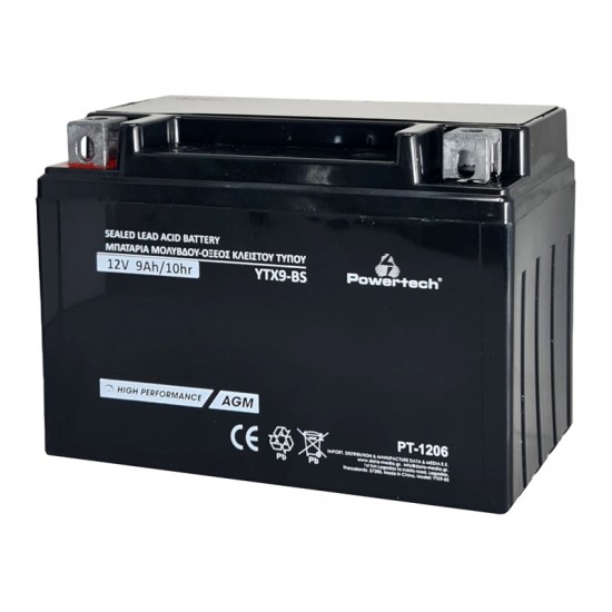 POWERTECH μπαταρία μολύβδου μοτοσυκλέτας PT-1206, 12V 9Ah, AGM, YTX9-BS